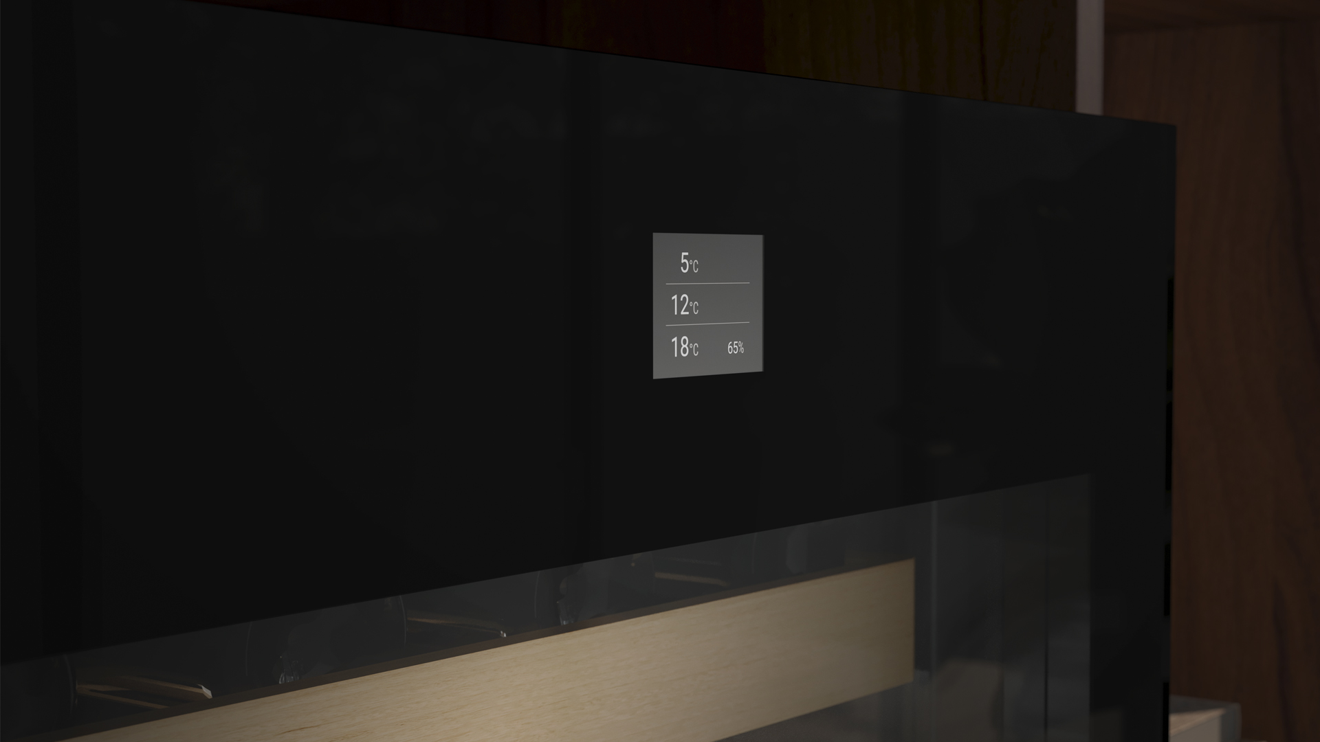 Mențineți condiții de temperare perfecte în aparatul dumneavoastră pentru vinuri, fără a deschide vreodată ușa. Afișajul din sticlă Touch & Swipe vă permite să parcurgeți cu ușurință interfața atrăgătoare și să gestionați temperatura și umiditatea pe ecranul cu culori vii. Chiar și când nu este în uz, afișajul vă oferă actualizări în timp real cu privire la temperatura fiecărei zone.