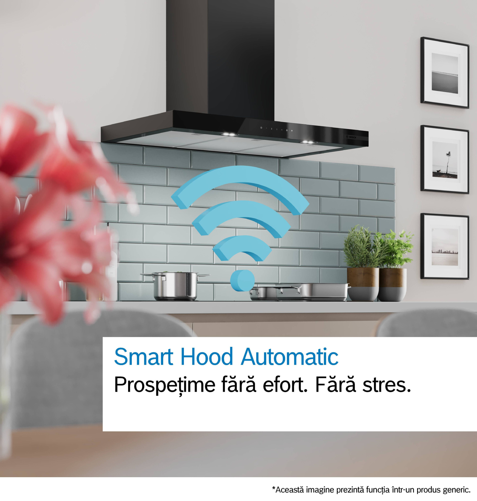 | Smart Hood Automatic: Hota adaptează automat viteza ventilatorului datorită plitei, care transmite continuu date despre gătire (funcționează cu toate plitele cu inducție actuale din Seria 6; pentru alte plite Home Connect, hota poate fi controlată direct de pe plită, cu condiția să existe un cont Home Connect conectat). |