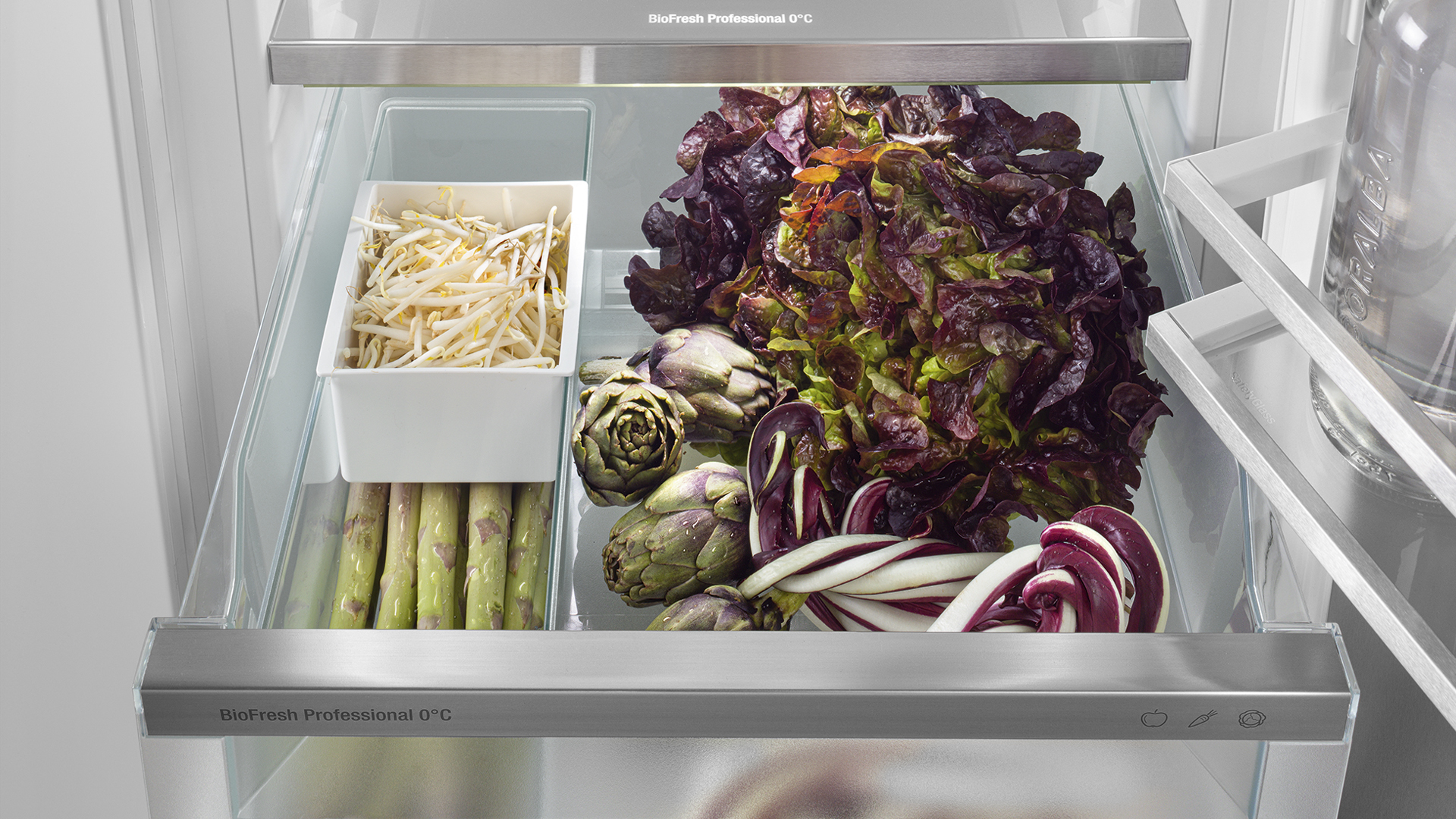 Sertarul BioFresh Professional oferă alimentelor un plus de prospețime pentru o durată de depozitare mai lungă - inclusiv efectul wow: Datorită HydroBreeze, o peliculă de apă rece acoperă fructele și legumele ca un balsam protector. În combinație cu o temperatură de puțin peste 0 °C și o umiditate ridicată, fructele și legumele neambalate se simt ca acasă.