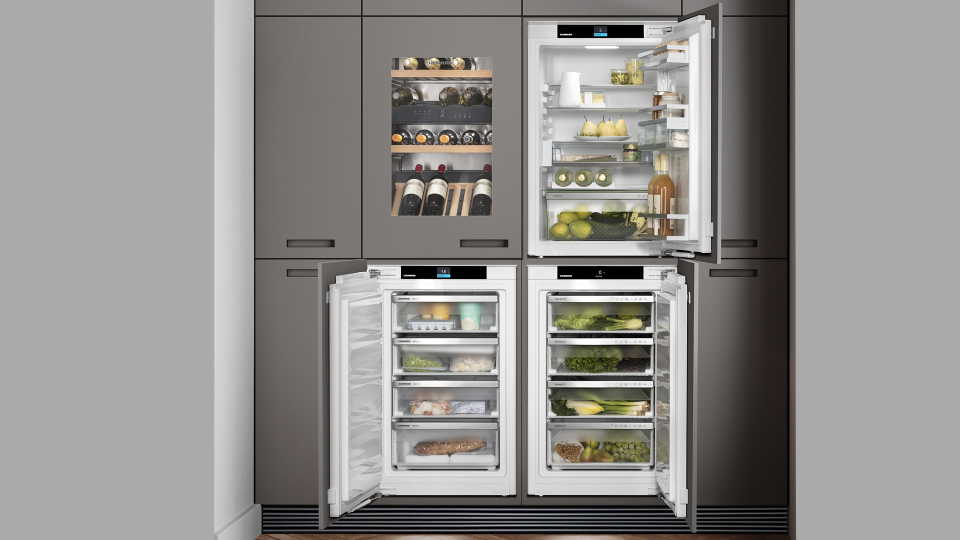 Indiferent dacă sunt unul lângă altul sau unul deasupra celuilalt: Aveți posibilitatea să vă poziționați aparatele Liebherr în mod modular, exact cum doriți. Realizați propriul dumneavoastră Frischecenter din combinația de frigider, congelator, răcitor pentru vinuri sau BioFresh full-space. Calitatea tipică Liebherr: O tehnologie specială în plafon şi pereţii laterali împiedică apariţia condensului între aparate – în acest fel mobilierul dumneavoastră este complet protejat.