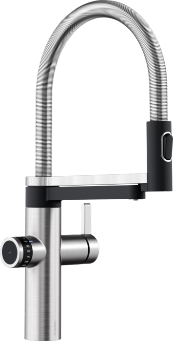 Baterie mixer semi-profesională 3 în 1: apă rece, caldă și filtrată Click + Touch: Cantitatea exactă de apă filtrată setată convenabil prin intermediul rotiței de scalare precisă și al controlului tactil intuitiv pentru consumul de apă la cerere Filtrul multi-etajat BWT de înaltă calitate reduce calcarul și îmbunătățește gustul