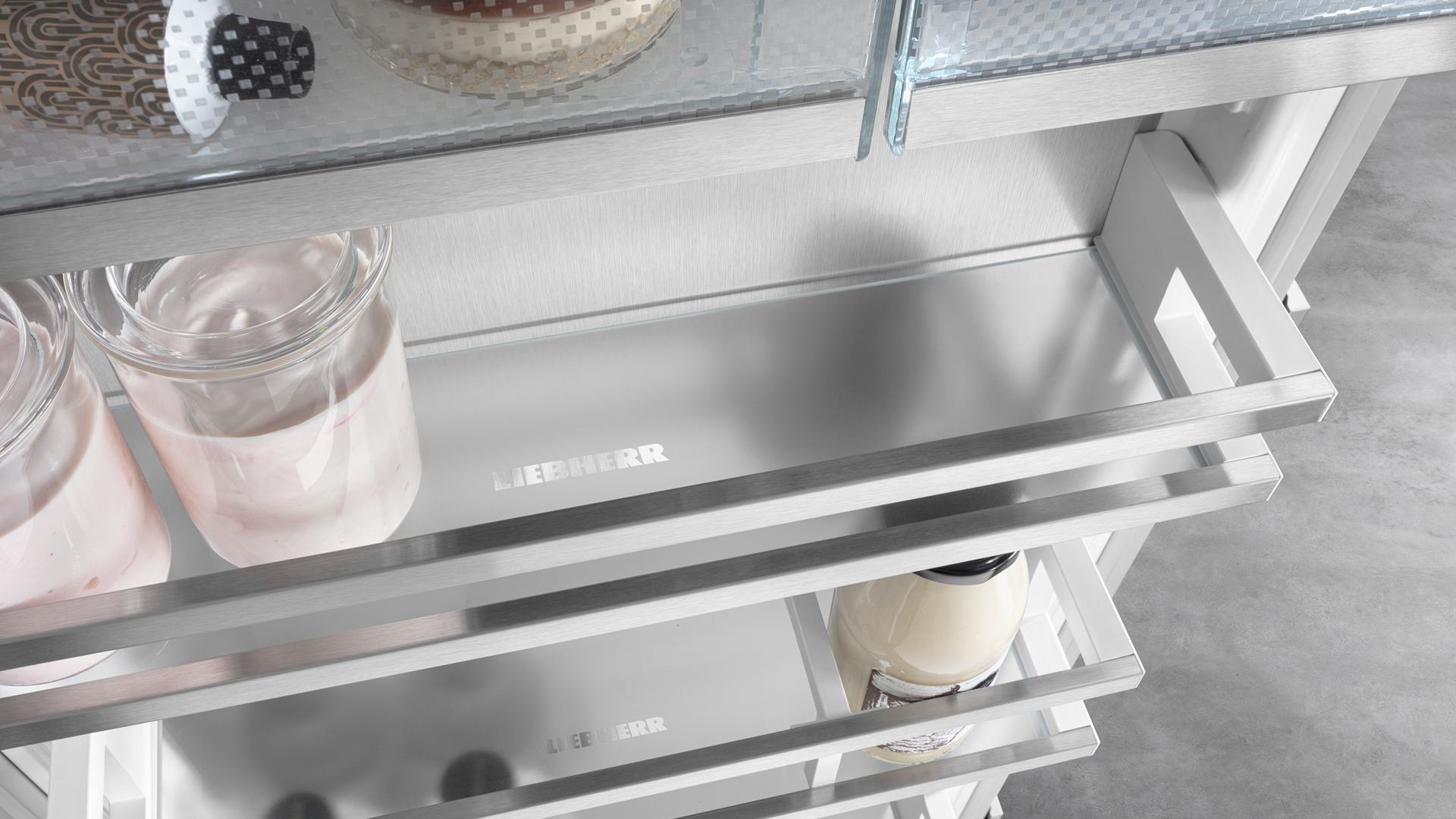 Doriţi să păstraţi proaspete prăjiturile de casă? Sau Pizza preparată, care trebuie introdusă în cuptor mai târziu? Pur şi simplu glisaţi tava dumneavoastră de gătit în aparatul dumneavoastră Liebherr¬– vă oferă mult spaţiu pentru a depozita o tavă de gătit. Deosebit de practic: Puteţi glisa în interior şi exterior tava de gătit la deschiderea uşii de 90°.