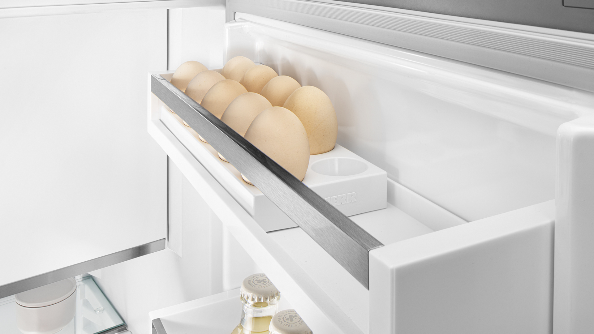 Doriţi ouă de găină? Şi aparatul dumneavoastră Liebherr – de aceea posedă compartimentele pentru ouă 2in1. Acestea oferă nu numai spaţiu pentru până la 20 ouă de găină, ci şi pentru până la 24 ouă de prepeliţă. Compartimentele pentru ouă constau dintr-o parte exterioară şi una interioară, care pot fi glisate una în cealaltă. Prin rotirea compartimentului pot fi utilizate orificiile pentru ouăle de prepeliţă.